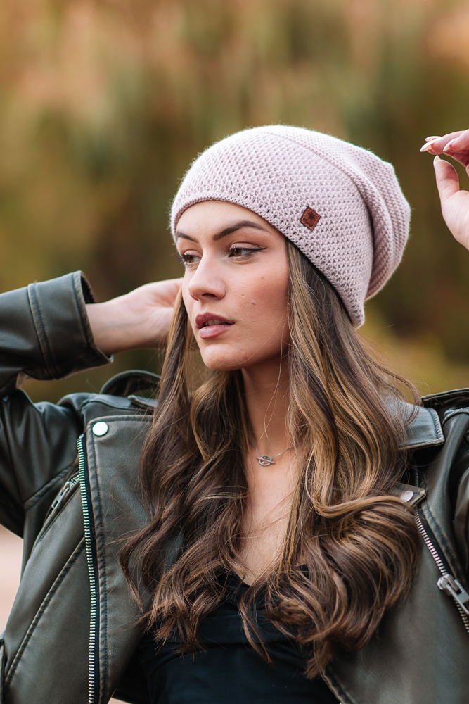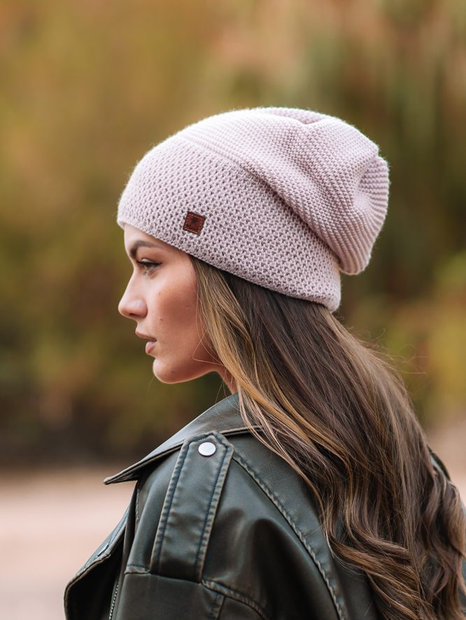 Дамска висяща шапка .Състав ,87%акрил и 13%полиамид .Много приятна,мека материя.Актуално предложение за сезона.
