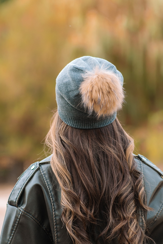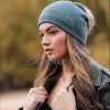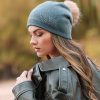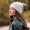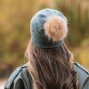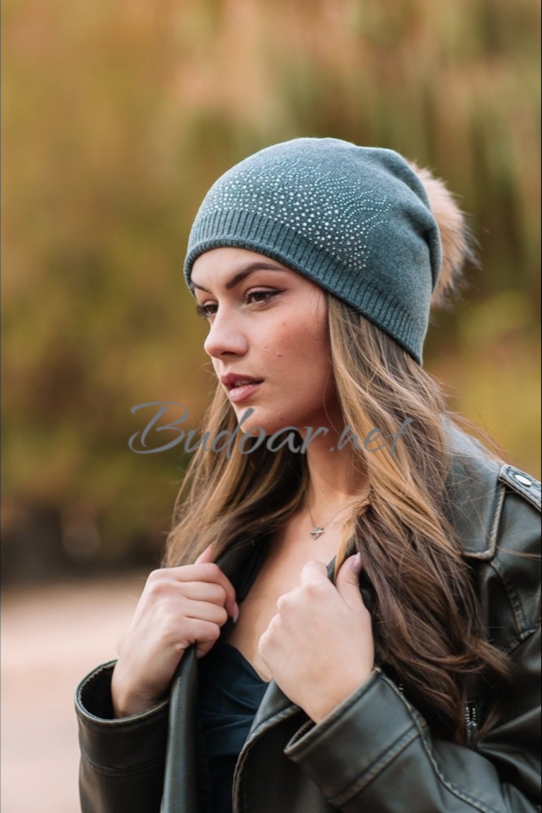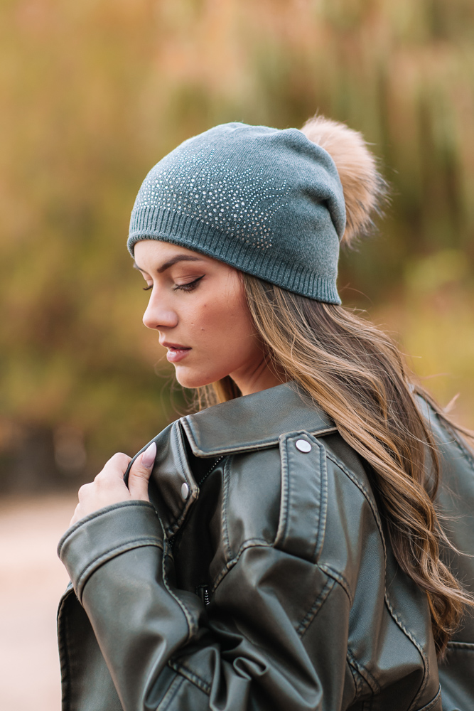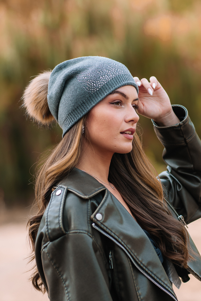 Дамска шапка с помпон от естествен пух и украса от мъниста.Помпонът може да се маха .Състав ,80% вискоза и 20%ангора .Много приятна,мека материя.Актуално предложение за сезона.