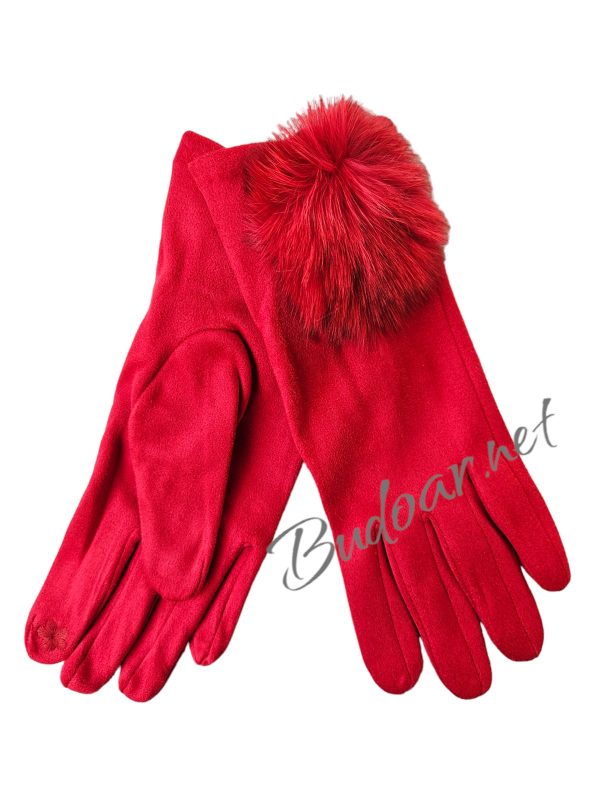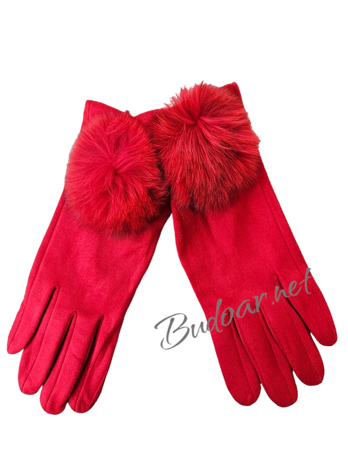 Елегантни дамски ръкавици.Състав:67.3% полиестер 29.2% памук 3.5% еластан .Ръкавиците са помпон от естествен косъм от лисица.Размерът е универсален/вследствие на еластана/.Имат бродерия на показалеца за ползване на тъчскрийна на телефона.