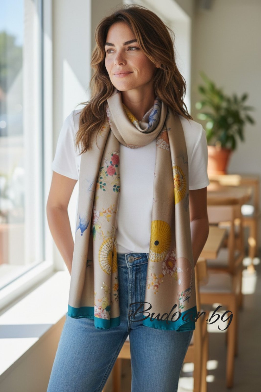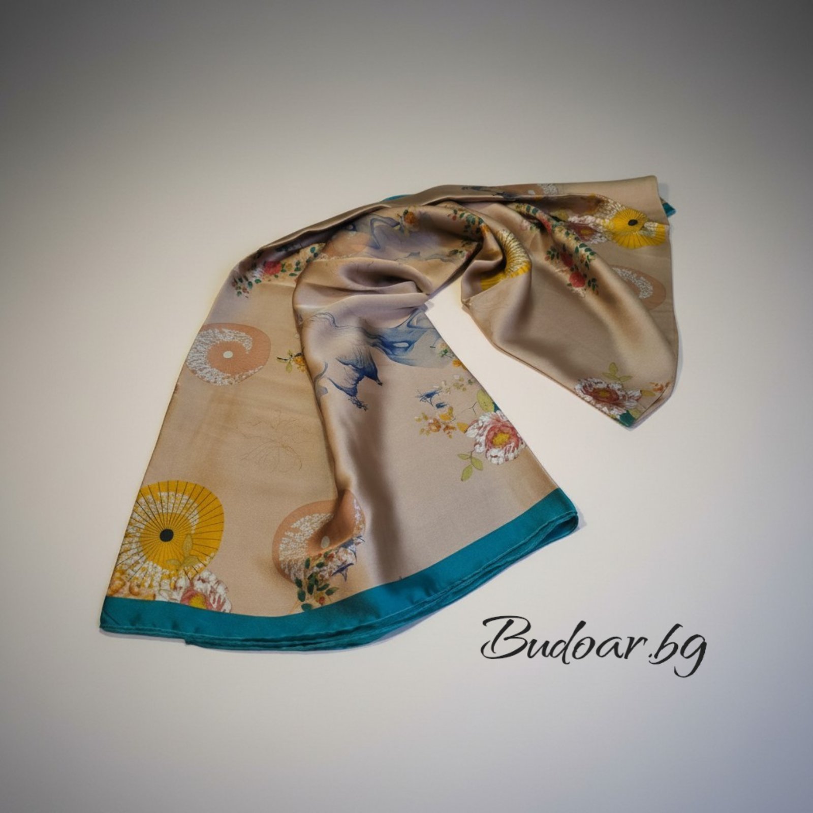 Красив цветен шал изработен от полистерна коприна.Подходящ за пролетно- летния сезон.Размер 75/180 см.