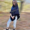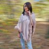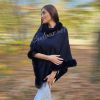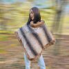 Дамско пончо с пух.Състав 50%вълна ,50% памук.Пончото е с универсален размер,подходящо за дами ,както със слаба фигура,така и с по едра.Обиколка на бюста до 130 см,дължина 81 см.