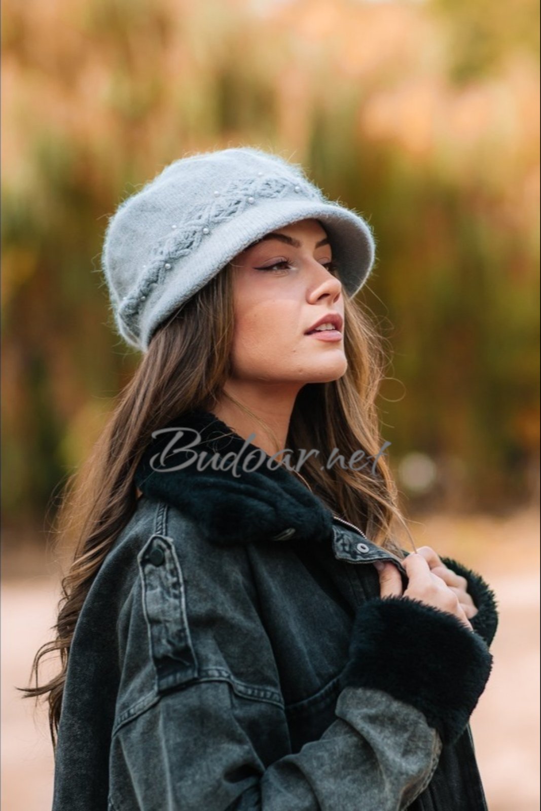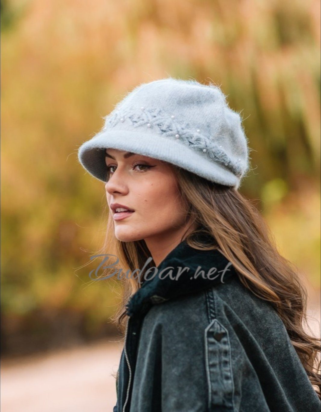 Елегантна шапка с малка периферия.Състав ,40,9% акрил, ,59,1%ангора.Топла подплата.Актуално предложение за сезона.
