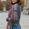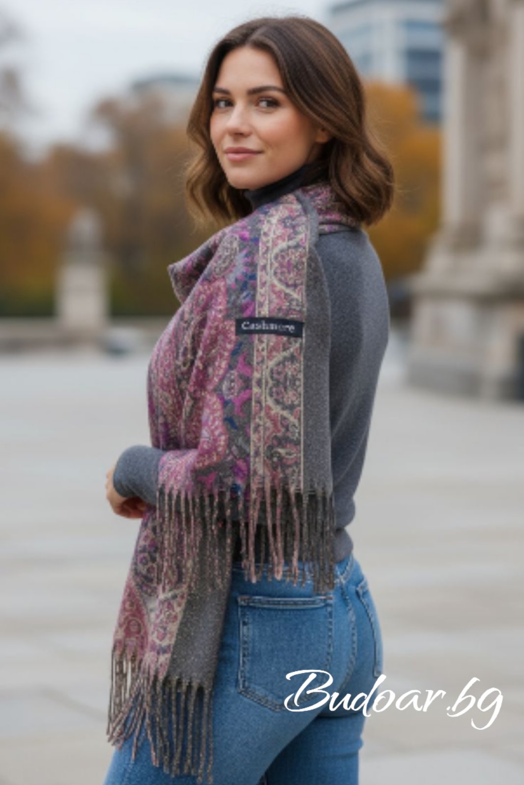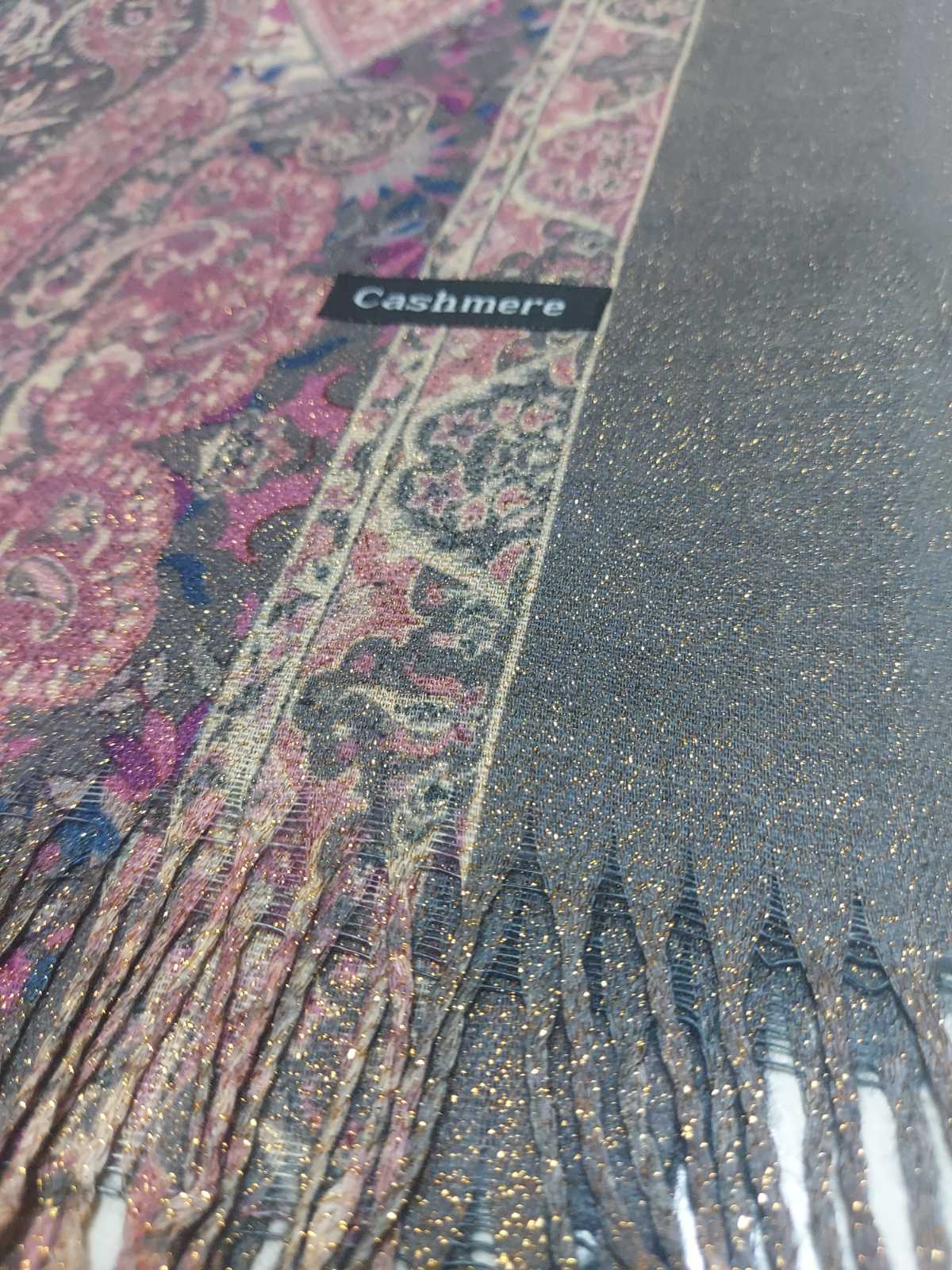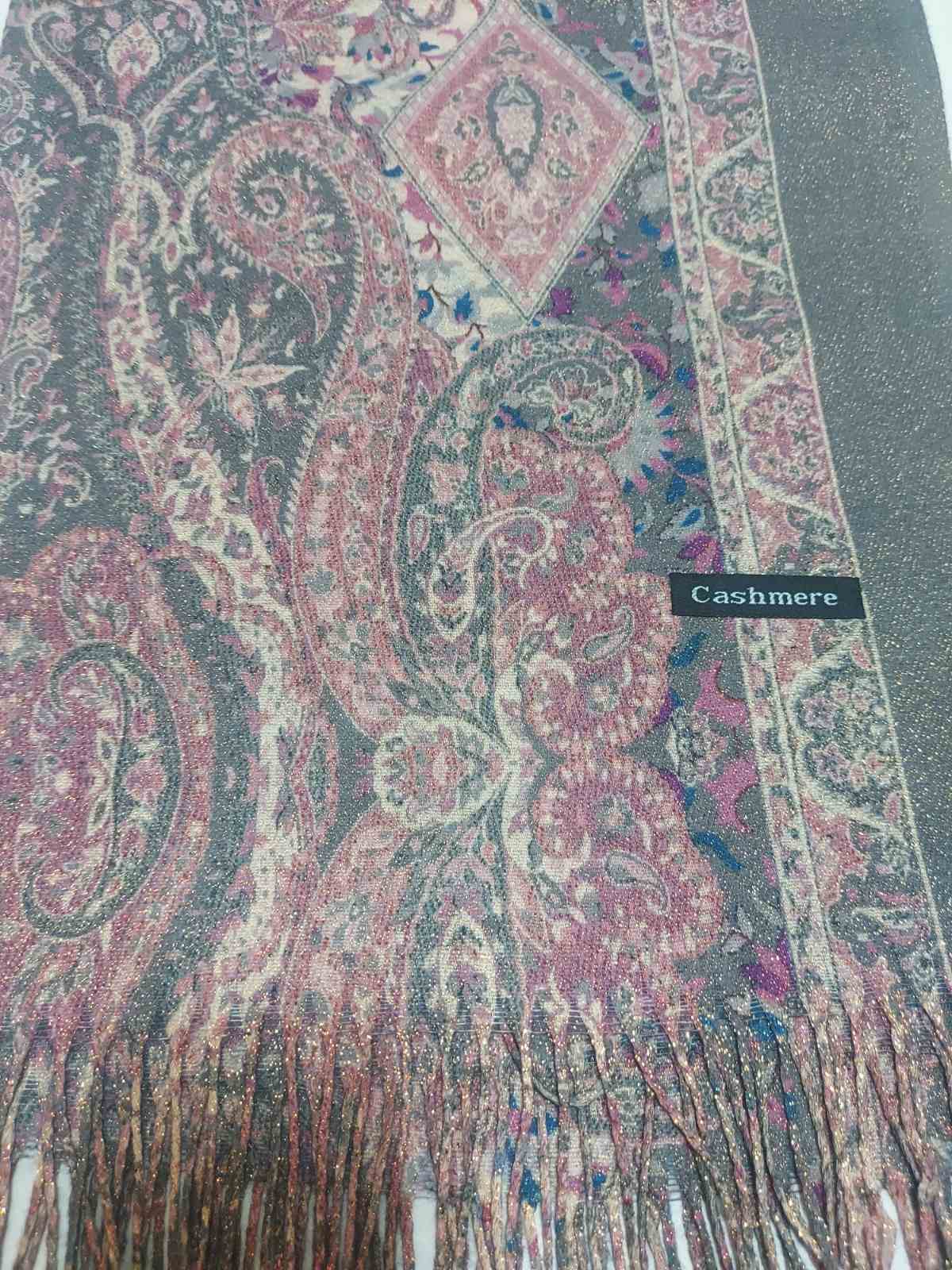 Красив цветен шал изработен от фин кашмир с втъкани златни нишки .Подходящ за есенно-зимния сезон.Размер 75/180 см.