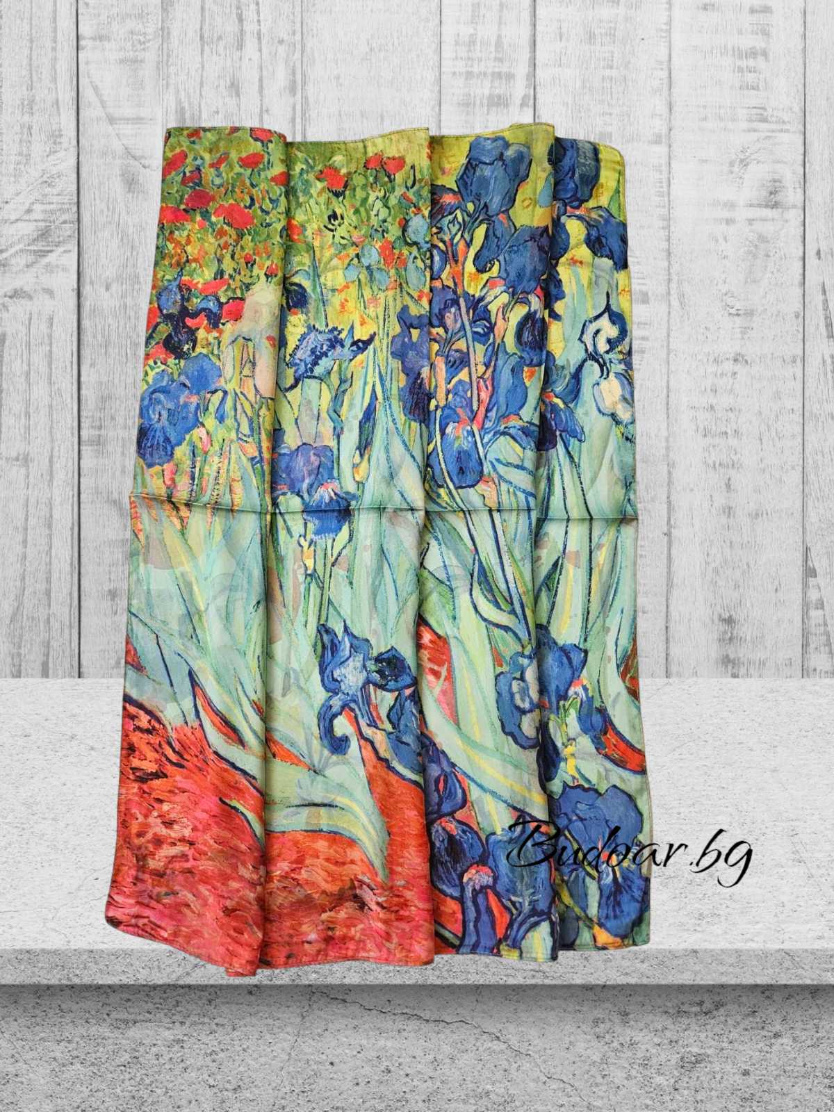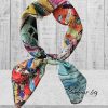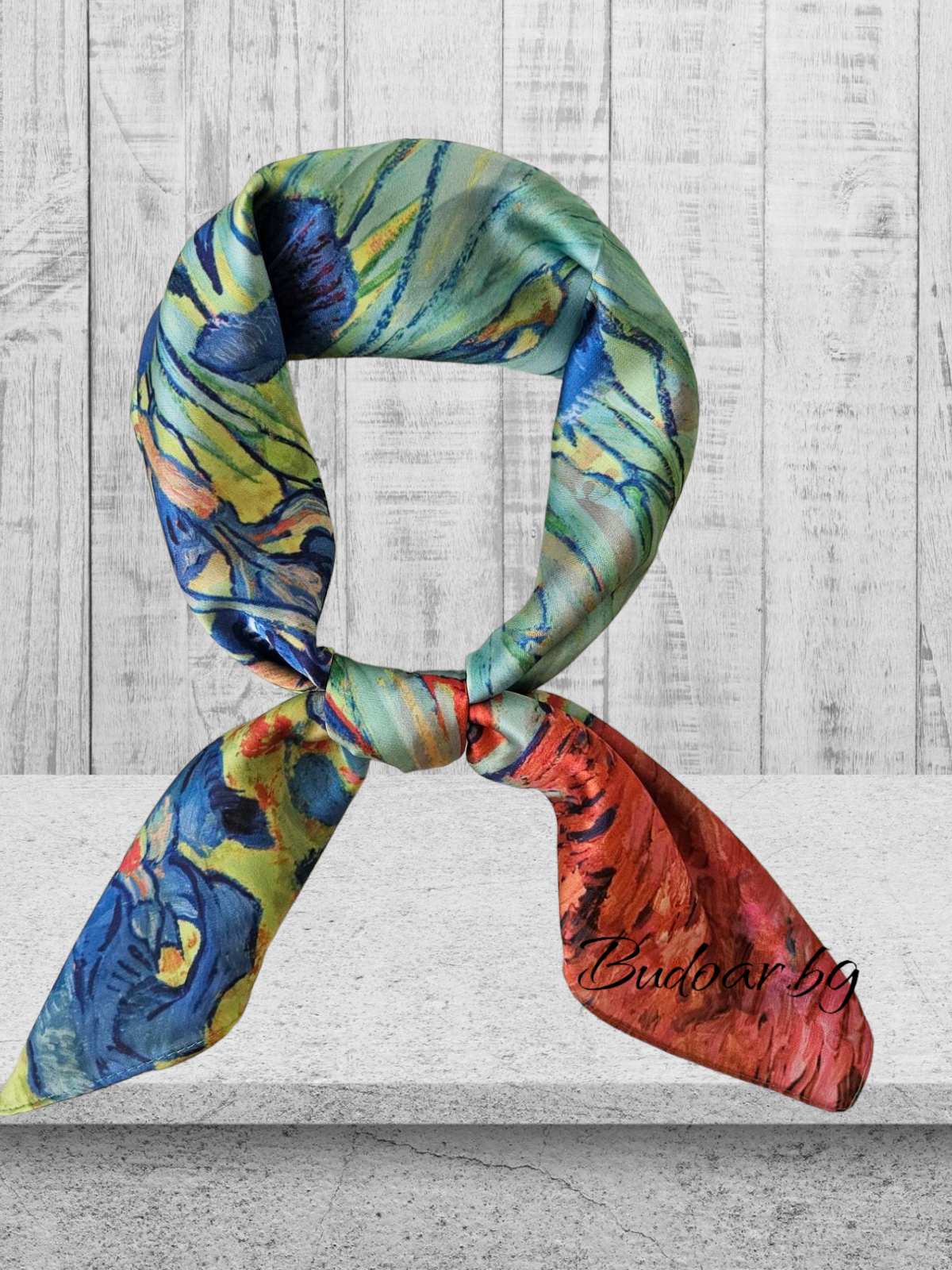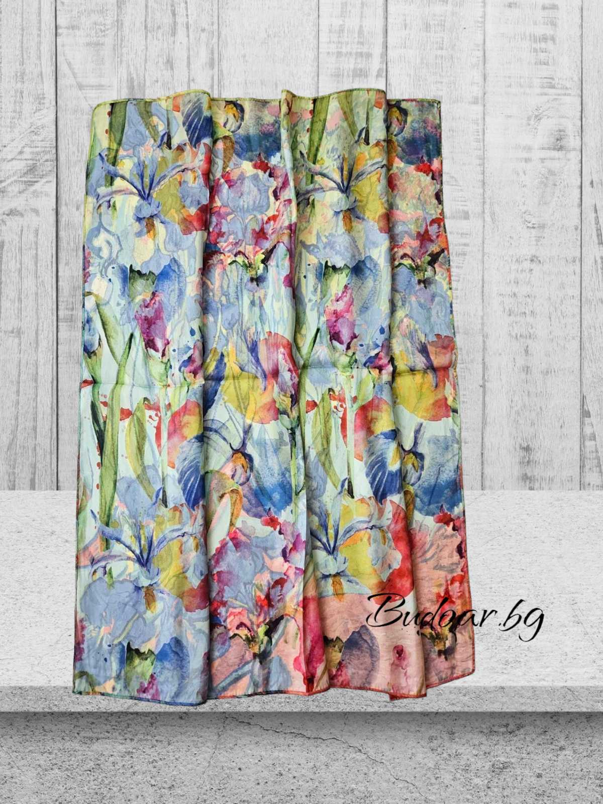 Елегантен копринен шал подходящ за пролетно летния сезон.Състав 100 % коприна.Размер 70/70 см.Шалът е двулицев.