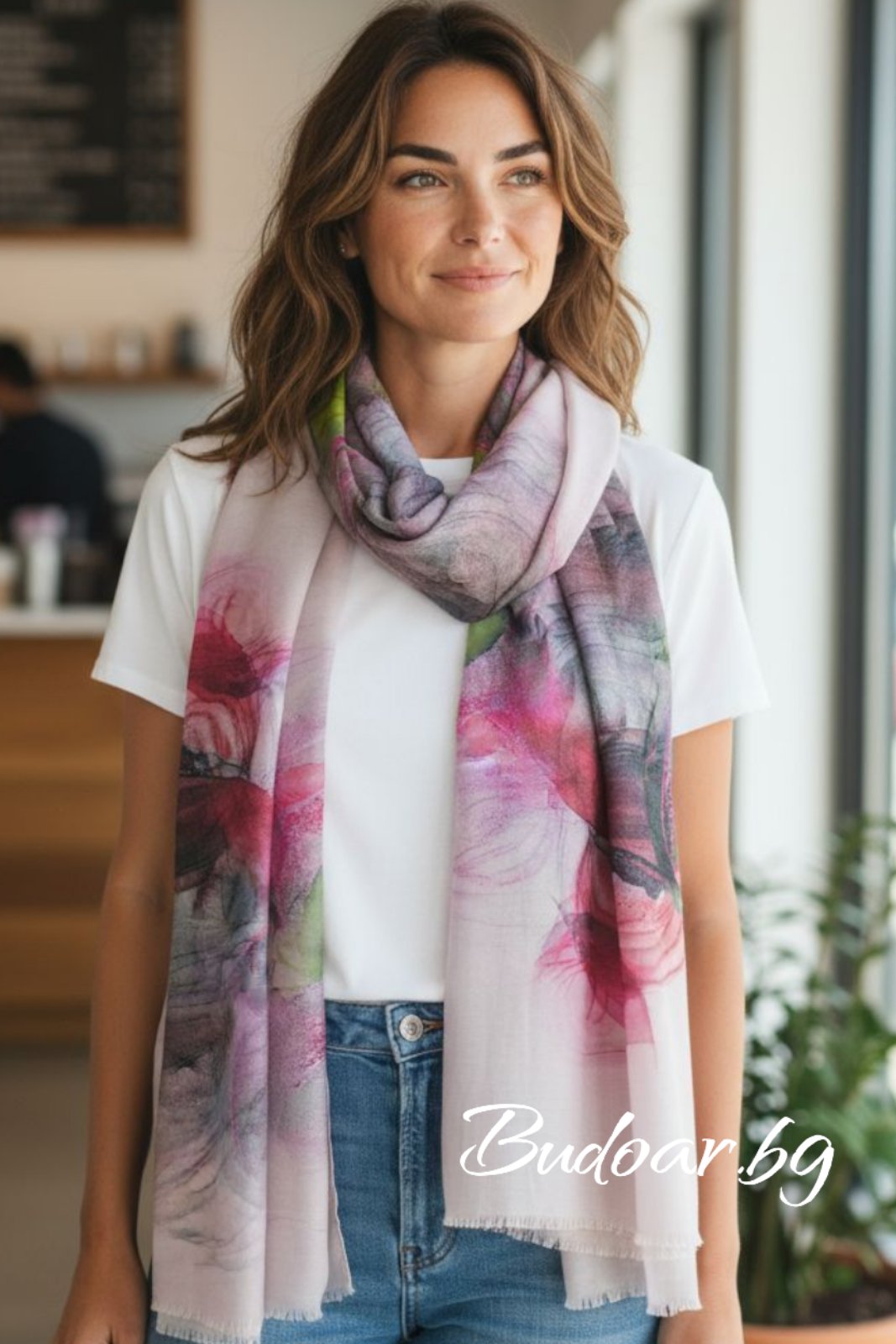 Красив дамски шал. Изработен е от 100% памук.Подходящ за есенно-зимния сезон.Размер 90/180 см.