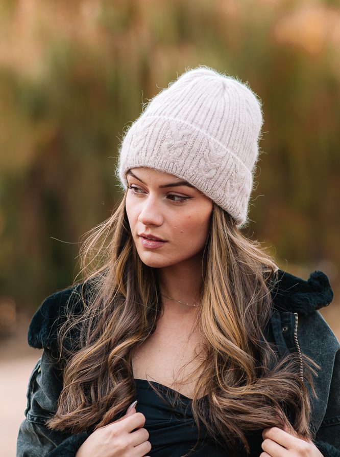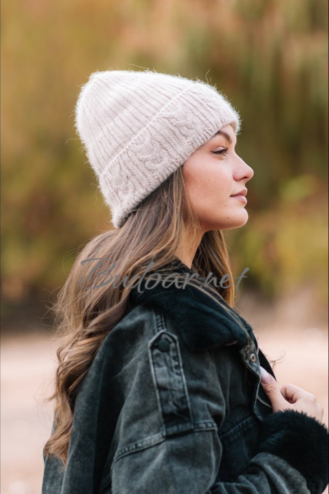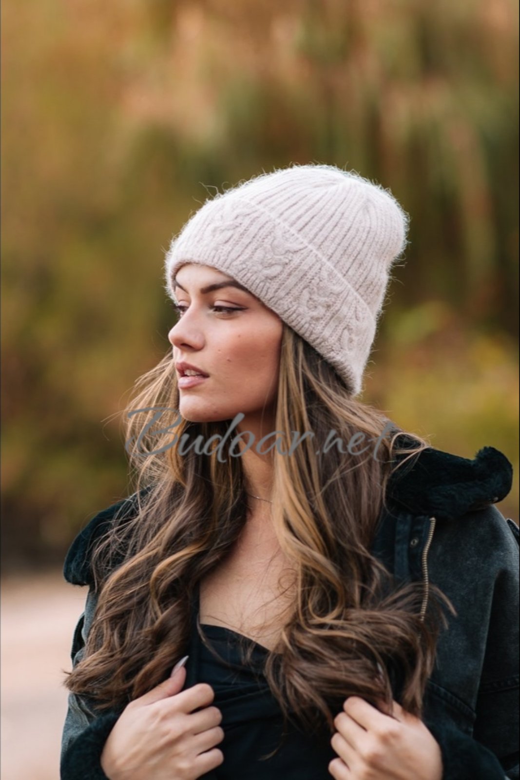 Плетена дамска шапка с изчистен модел.Състав ,40,9% акрил, ,8.9%ангора,41.4%найлон,9.2%полиестер.Подплата от поларВ шапката има втъкани нишки от ламе.Актуално предложение за сезона.